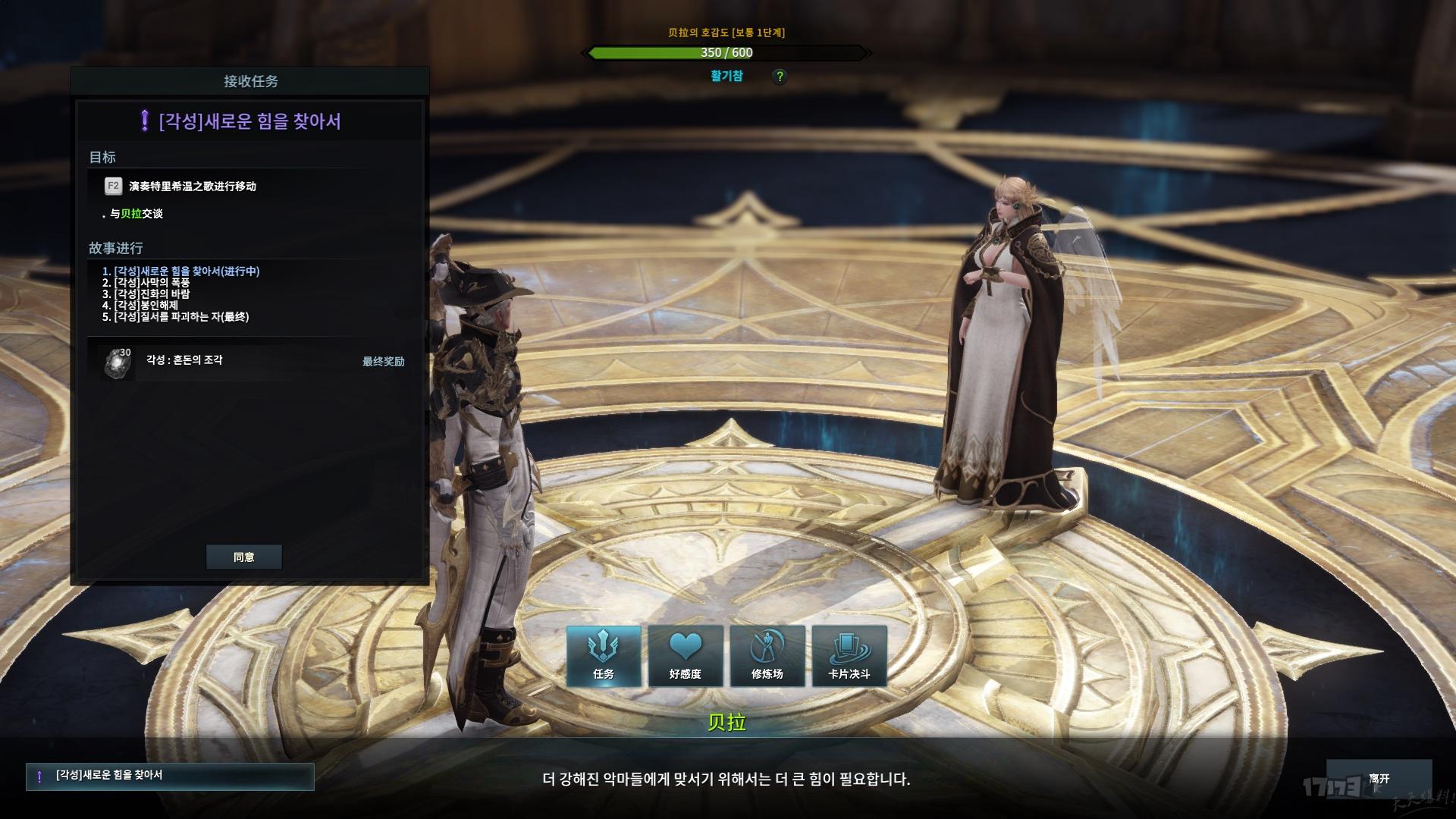 然后跟着任务走,之后按F2 演奏 特里希温之歌 进去找美女贝拉 然后对话完成后会多一个V技能 超级觉醒技能 是召唤一个狮子