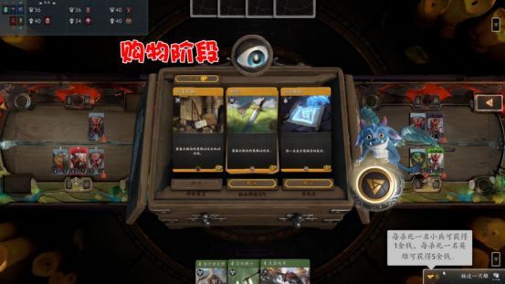 第一回合到这里就结束了,接下来是购物阶段。我们可以通过击败敌方小兵和英雄来获取金币,购买装备和消耗品。这里的重点是,装备只能给英雄使用,并且每个英雄只能拥有一件同类型装备。