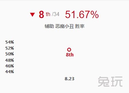 如图辅助小丑的胜率数据仅在S9季前赛版本中有,其数值为51.67%,是一个非常不错的胜率水平。