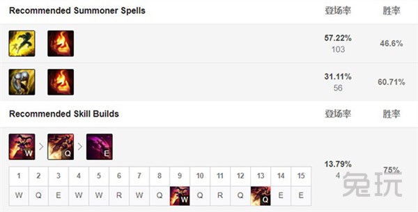 这里建议对这个打法有兴趣的玩家可以先使用引燃闪现,熟练之后再尝试引燃虚弱,技能加点如图所示,1级W,2级Q或E,然后主W。