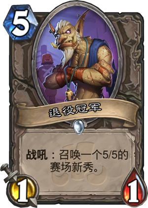 中立普通随从:退役冠军。进化萨的好卡,替代退环境的“犯罪高手”位置,其他无进构筑可能。“犯罪高手”在过去的竞技场的一张优质大哥,这张同样如此,朴实无华,中期拍下感觉就很稳,还不错的卡。