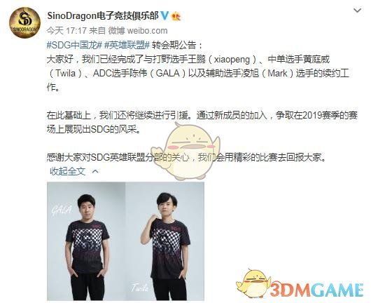 大家好,我们已经完成了与打野选手王鹏(xiaopeng)、中单选手黄庭威(Twila)、ADC选手陈伟(GALA)以及辅助选手凌旭(Mark)选手的续约工作。