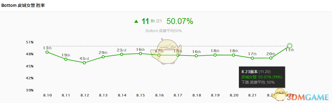 在8.23版本中,女警的胜率一下子就来到了AD中游的水平,比起之前常年垫底的胜率,现在的胜率可以说是好了很多了。