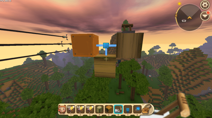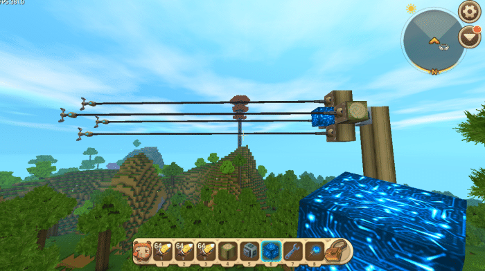 玩家首先制作了一个旋转的风车,流程这里再说一遍,防止萌新不会。用方块建造一个竖着的柱子,然后在柱子顶端的一侧装上转轴方块,在转轴方块的前面做出一个扇叶的形状,在柱子顶端放上开关!玩家也可以自己完善扇叶的形状,只要不影响扇叶前面的推拉机械臂即可!