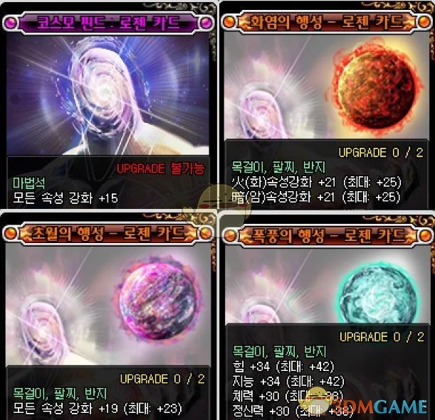 超时空附魔卡的外观都很相似,采用宇宙恶魔罗什的外观,唯一一张粉卡增加右槽15点属强。三张属强传说卡分别是火暗属强25点,光冰属强25点,全属强23点,最后一张传说属性卡增加首饰四维,力量和智力42点,体力和精神38点。