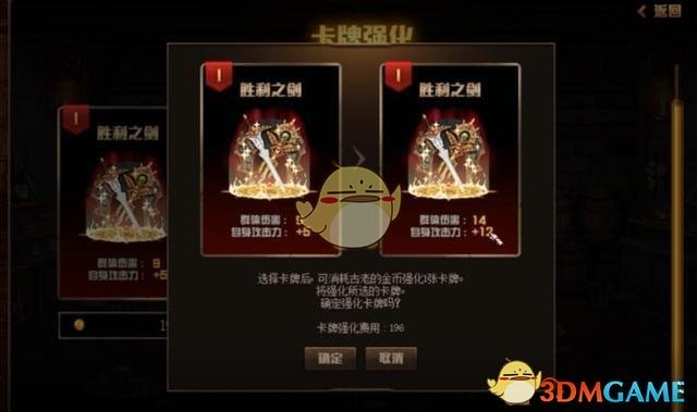 所以,只要你遇到这张神卡,不管是商店出售也好,还是刷怪掉落的也罢,一定要无脑拾取!并且在遇到商店之后,要优先升级这张卡。这张卡仅仅需要1个行动点数,假设你手上有3张胜利之剑,那么第一次伤害为14,第二次就是群伤26,第三次就是群伤38,合计伤害为78点,没有任何小怪能扛过去一回合的,15分钟时间刷88层足够了!