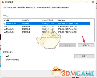 6、这个时候下面已计划的优化显示关闭,上面几个驱动器,右边的当前状态,找我的人中很多人的状态是需要优化,这个时候点击选中需要优化的磁盘,然后再点击优化,在优化完成后,当前状态会显示正常。