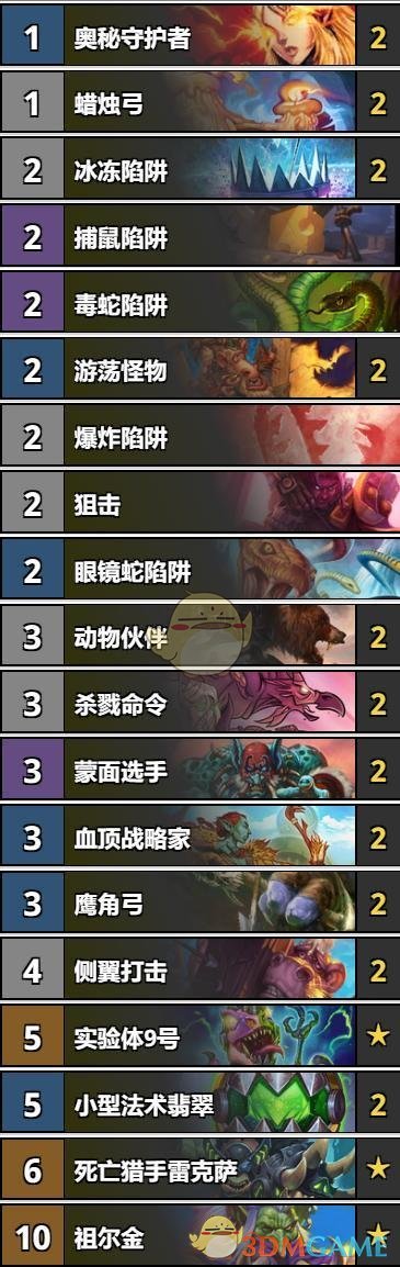 就是下面这套卡组,一张中立牌没有,全部是法术牌,正儿八经的法术猎。基本构架还是沿用的上版本的,因为拉斯塔哈大乱斗中只是加入了2张新法术牌,祖尔金虽然单看强度没有达到逆天的效果,但是也可以算是版本中T1级别的,主要是配合法术猎以后直接胜率超过60%,小编用这套组合真的感觉就是吊打一切。祖尔金玩起来绝对是真香。