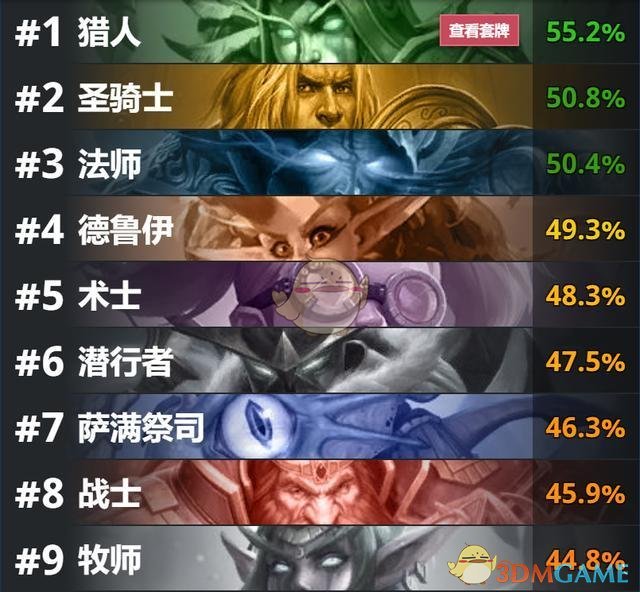 作为一个“有姿势、有学问”的小编,说话必须要以数据为依托,咱不能顺嘴胡说。那么好了,通过外服炉石数据统计网站(hsreplay)显示的最新胜率排名,猎人已经以55.2%的胜率登顶榜首,高出第二名将近5个百分比,这已经到了逆天的地步了。