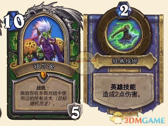 首先看看祖尔金的证件照,看起来是那么的平凡的英雄技能,增加2点伤害和其他猎人DK比较一下,可以说是惨不忍睹。但是最重要的就是战吼效果“施放你在本局对战中使用过的所有法术(目标随机)”重要的事情说三遍,施放所有法术、施放所有法术、施放所有法术。所以法术猎祖尔金才有了用武之地。