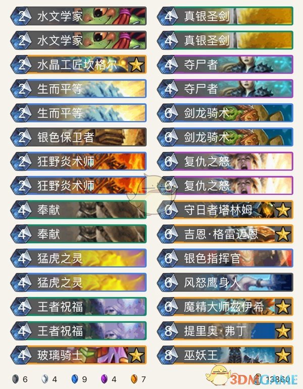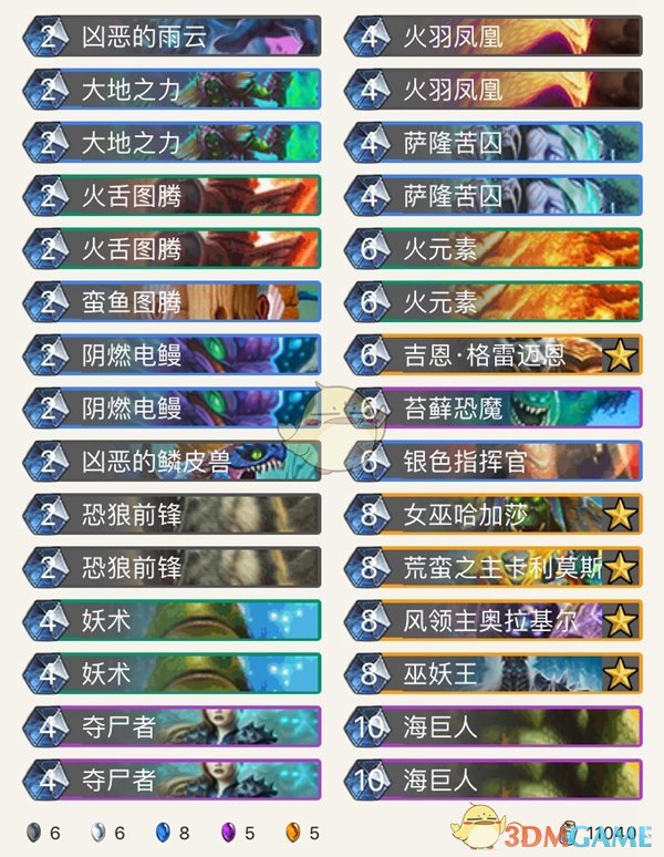 我们这套卡组只有两张卡牌的费用超过了八费,打到后期一张魔精大师能让你的对手瞬间失去反抗能力,而我们却能依旧靠着各种低费随从和buff类法术稳步进攻。