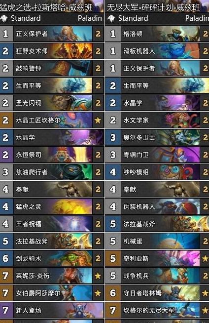 5.骑士:猛虎之选主要是通过永恒祭司回手BUFF类法术,最后可以0费上猛虎之神,炎伤也会变得非常强大。这套卡组最怕的是变形术和沉默,不过一般玩家只带一个沉默的话,是不够用的。无尽大军基本上还是蛋骑,变动不大。