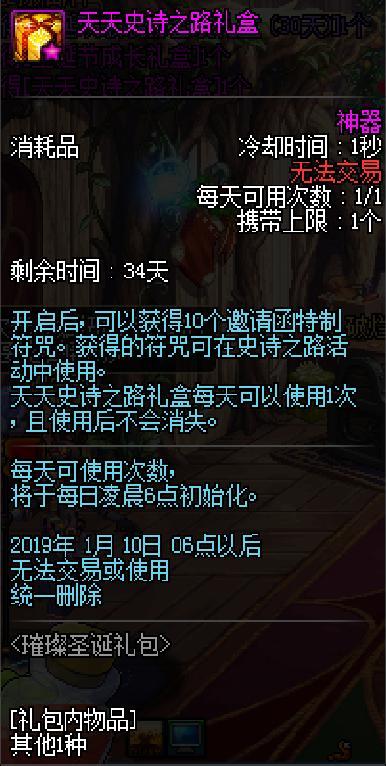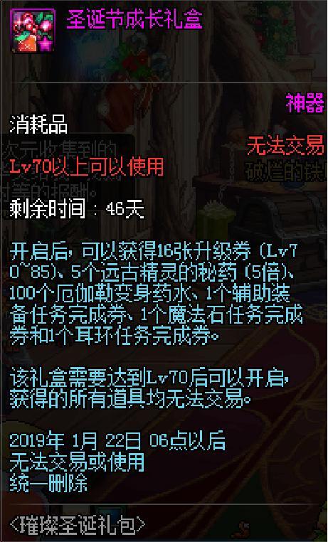 圣诞节成长礼盒开启限制为70级,并且礼盒内有16张升级券,也就是大家可以从70级直接升到86级,对于号里有小号需要升级的玩家来说还是不错的,并且还有5个5倍的经验胶囊,轻松升满90级,不过因为史诗之路要求极低,所以毕业票肯定是刷史诗之路,因此100个大眼仔如果有期限就根本没有用了,除了这些还有辅助装备、魔法石和耳环任务完成券,这3个特殊装备完成券能省下一些金币。但是不足以抵消25块钱。