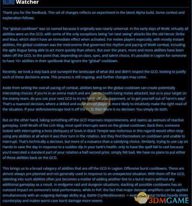 针对于公共CD调整的相关问题一直受到美服玩家吐槽,而且从8月份《争霸艾泽拉斯》上线至今wowhead论坛上就从未停止过对于这一修改的批评。面对美服喷子的“骚扰”暴雪终于在近日“被迫”发布蓝帖声明将原有的公共CD移除。这位名叫Ythisens的社区经理公布了蓝帖内容。