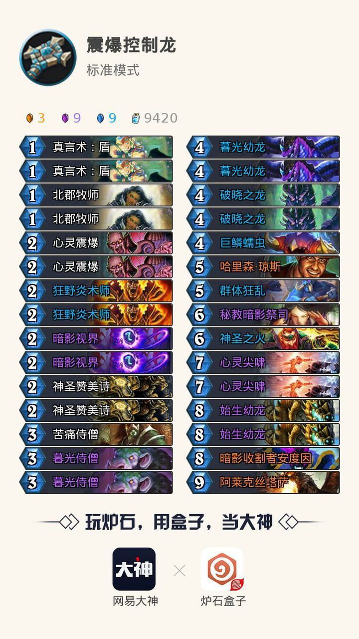 奇数骑:大优对局。奇数骑就是弟弟,起手好甚至可以满血吊打。无穷无尽的aoe和优质生物慢慢消磨奇数骑血线,然后再伺机斩杀。这里就不再细说了,主要要注意的是aoe不要乱交,规划好自己的血量和返场的时机,蚊子龙也是我们返场的重点生物,4费一张蚊子龙,5费一个群体狂乱可能会起到意想不到的效果。起手炎术士破晓龙基本就一定胜券在握,何况奇数骑没了等级提升。