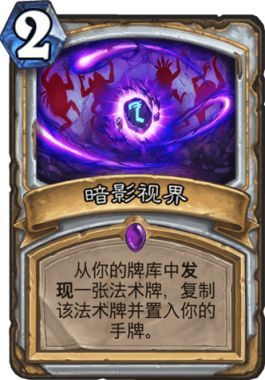 暗影视界:这张卡牌比较灵活,同时也是我们补伤害的一张关键卡牌,可以找震爆,为我们变身过后提供14-20点斩杀范围,其次使用起来也特别灵活,对阵快攻可以找低费法术配合炎术士清场,其次还可以提供群体狂乱,心灵尖啸等优质卡牌,是非常灵活的一张卡牌,但是有时候还是会缺少一点稳定性。