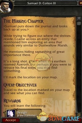珠宝训练师找到本书,其中的宝石刻着古怪的符文。之后让我们去找铭文训练师看看能不能弄明白说的是啥,铭文训练师说让我们帮忙找 3 本书参考。找到书后,铭文训练师解译出来,是马库斯的小黄书……