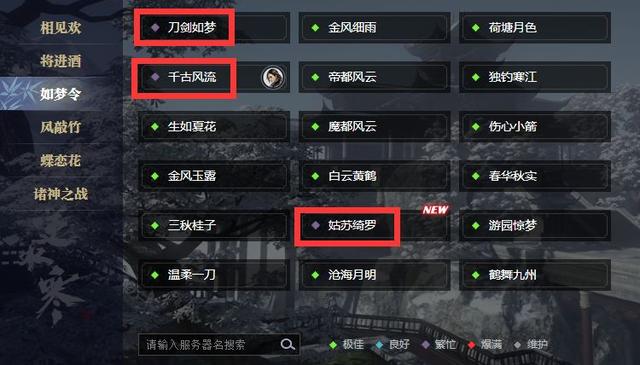 比如【如梦令】中的刀剑如梦、千古风流、姑苏绮罗就显得格外显眼,因为大区内剩余的所有服务器都绿了。