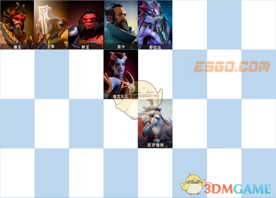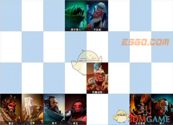 如图是己方存在恶魔情况下的阵型,由于恶魔本身较脆,又是前期重要的输出点,就需要保护其不会刺客切死。因此分出一个战士到后排代替恶魔成为被刺客攻击的目标,为恶魔争取释放技能时间。