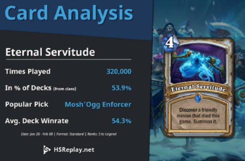 从某种程度上来讲,这张卡实在是太过OB。毕竟三选一,而且我们都知道,一般核弹流的牧师都有许多优质随从。比如黑曜石像,巫妖王,奇利亚斯,维纶等,所以,永恒奴役这张卡牌的确算得上是非常过分超模。因此,在未来退环境之后,是否也会,被增加2费,遭到削弱呢?这个我们就不得而知了。