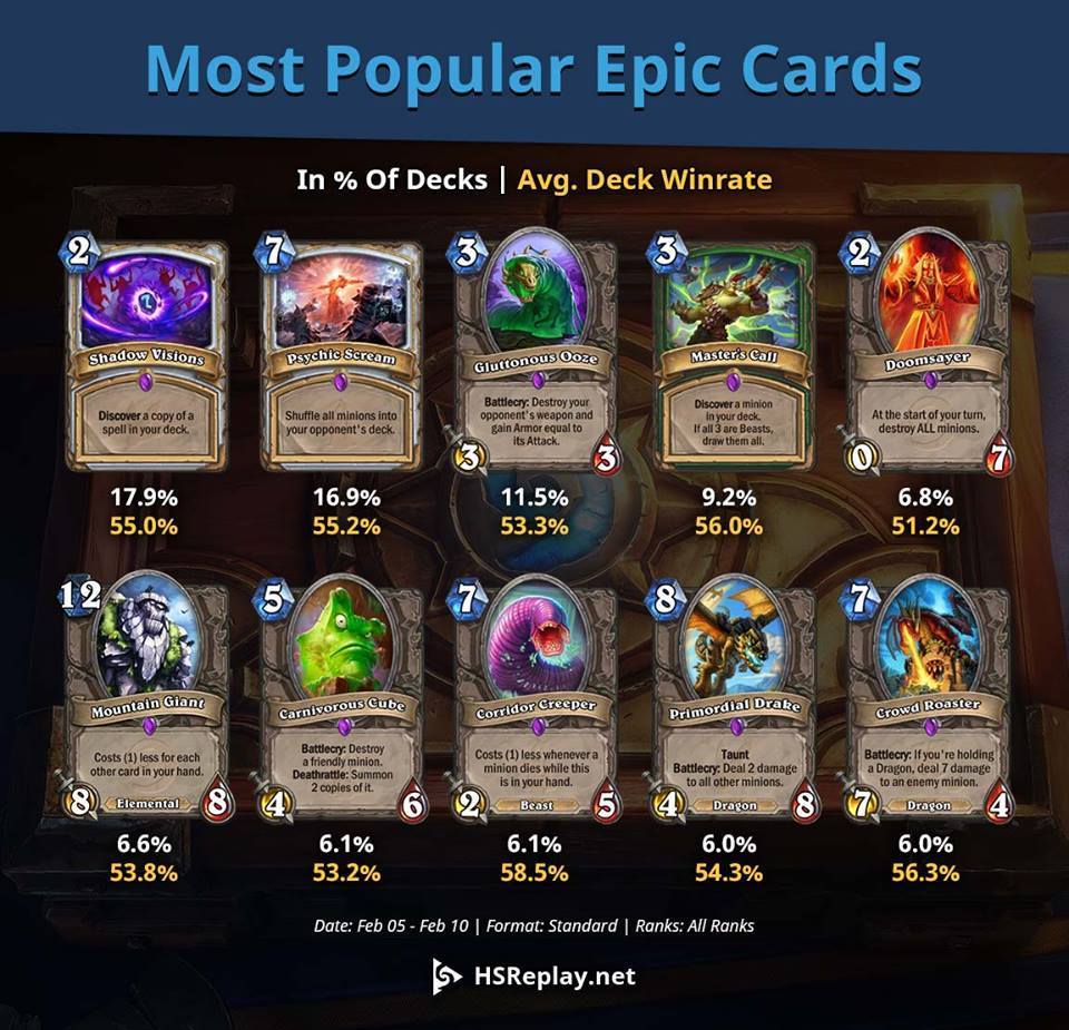 在近日国外数据网站统计的炉石传说最受欢迎史诗卡牌中,牧师职业紫卡“暗影视界”和“心灵尖啸”占据了前两位,猎人的职业紫卡“主人的召唤”第四,除此之外其他的全都是中立紫卡,那这是不是标志着牧师或成下一个被削弱的职业呢?在这些卡牌中,其中6张将在今年退环境,还有2张是经典卡牌,随着最近经典卡的遭遇不免让大家担心这2张卡是否也会被削弱呢?