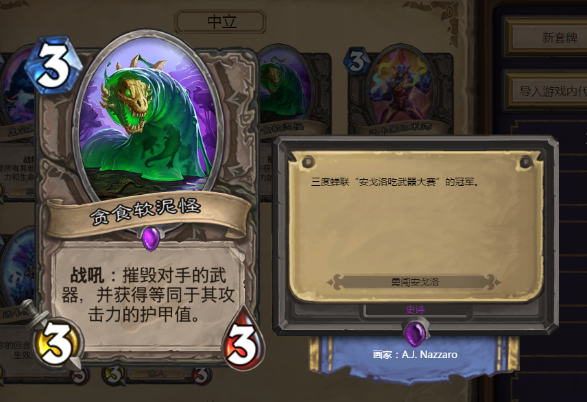 随着各种软泥怪的增多,现在的武器职业也是越来越难受,甚至出现了7软卡组针对弑君贼。与其他软泥怪不同的是,贪食软泥怪这张卡牌不但可以吃武器还能加护甲,此消彼长能在一个回合中赚到更多的场面和血量,最主要的是中立卡牌,人人都能带。