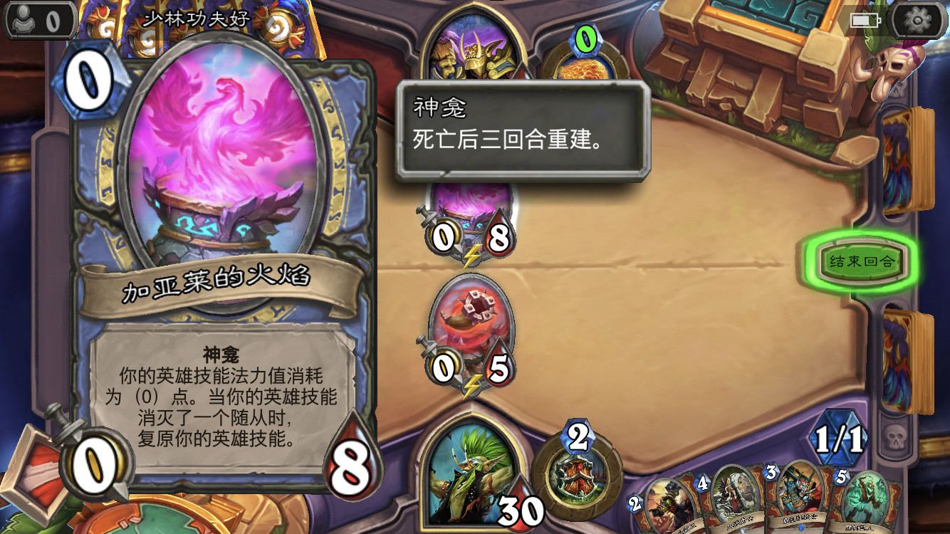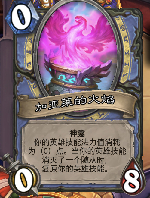 法师-加亚莱的火焰:英雄技能消耗为0,若用技能消灭了随从则复原你的英雄技能。