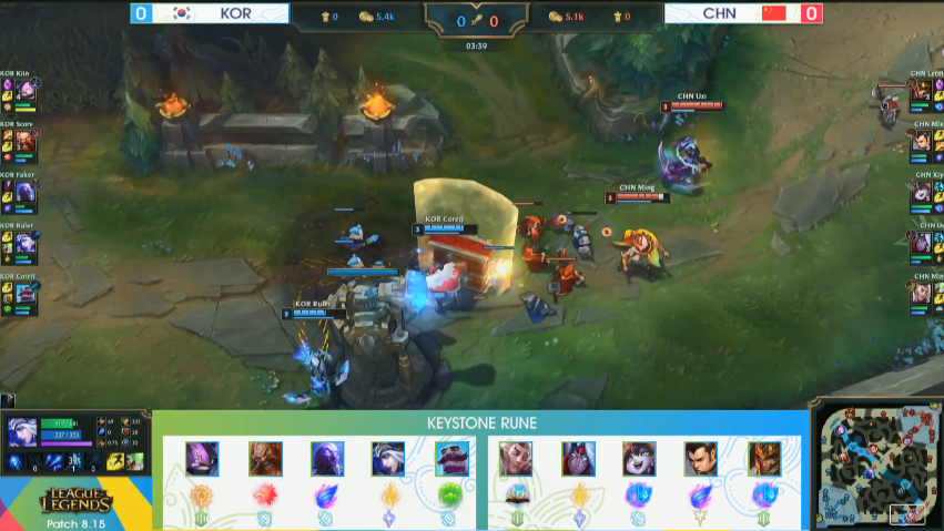 中国队选用:阿卡丽、酒桶、卡莎,韩国队选用:正义巨像、牛头艾希。