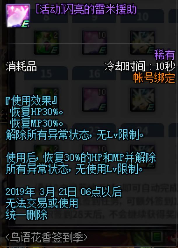 第一天的奖励是力量之源泉,使用后以为是获得持续5分钟的属性加成,但是神奇的事情,这药水一点用处都没有,只能在普通地下城中使用,星空裂缝,黎明裂缝,泰波尔斯均无法使用,而在普通图中使用后,角色变发光了,然后在怪物的脚底出现出现裂缝,然后喷射出爆炎攻击,伤害非常低,在范围内的所有怪物都会受到攻击,搬砖?一点用都没有。