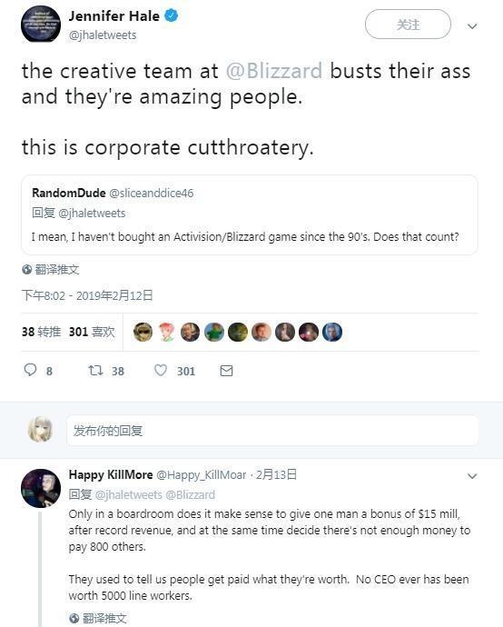 Hale推特大意:暴雪的创意团队勤奋又出色,而(动视暴雪)公司却是残忍而不择手段的。