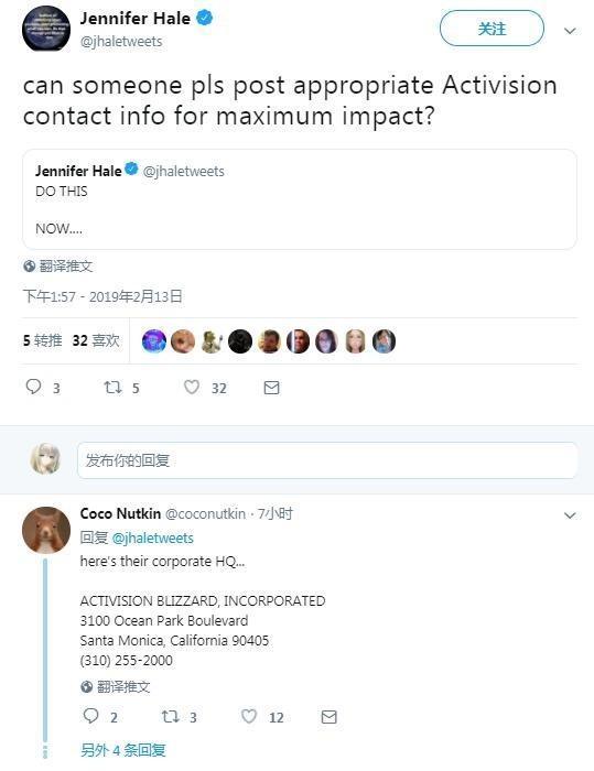 Jennifer Hale在今天也发布了多条推文,呼吁游戏开发者们起身反抗,她还请网友们贴出动视高管的收信地址,呼吁人们现在就向他们投出抗议信表达自己的意见。