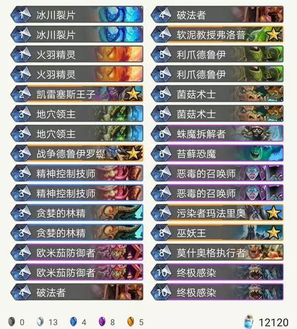 天梯中比较少见的卡组,这套别出心裁加了两张星火术来过牌兼打伤害,也算弥补了一些时候蓝龙德伤害不足的情形,可以轻松解掉犀牛等高威胁生物。蓝龙德打现在的牧师还是完全不虚的,有一些优势,只是打战士很难打。