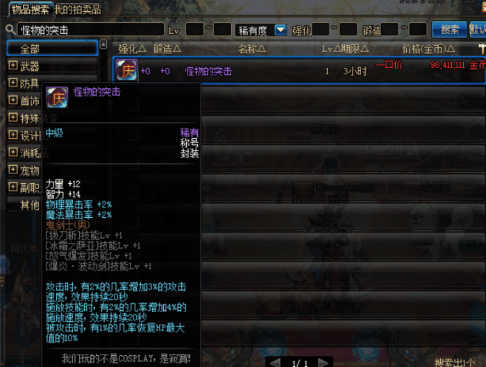 怪物的突击称号,2009国庆春节礼包称号,这称号恐怕是最久远的,能加职业的技能,在当时已经算很强的一个称号。而这称号在拍卖行仅剩一个,而且并没有达到一亿游戏币,这是当前最便宜的一个绝版称号。