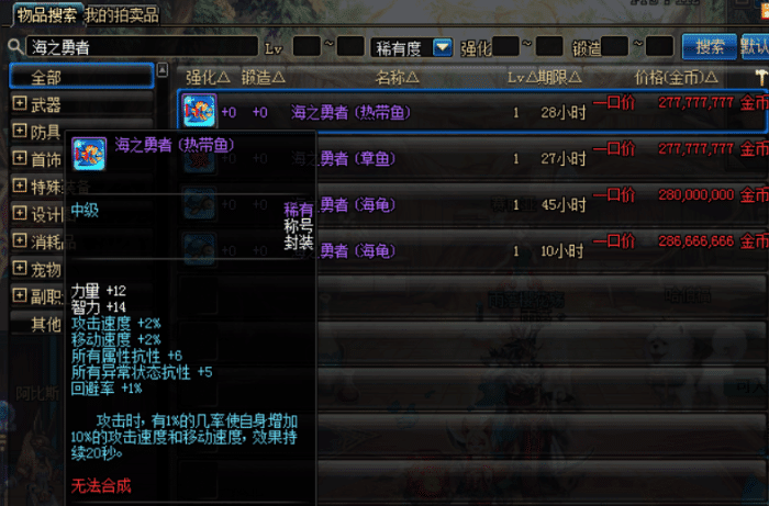 海之勇者称号,也是年代比较远的称号,2009年海之套装中的称号,这称号的属性也不强,但绝版的称号每个大区都很稀少,拍卖行尤其珍贵,海之称号就达到2.7亿游戏币。