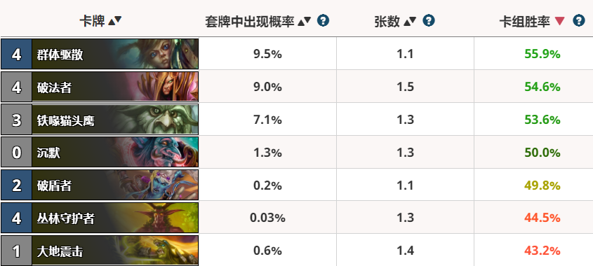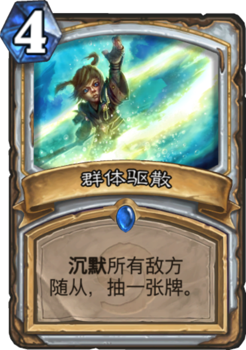 胜率最高的沉默卡就是牧师的群体驱散了,虽然费用要高一些,但对所有的敌方都有效,还能抽卡不亏手牌,可以让牧师比较安全的过渡到后期,也对一些组合套路有极强的针对作用,大多数牧师卡组都会带的。