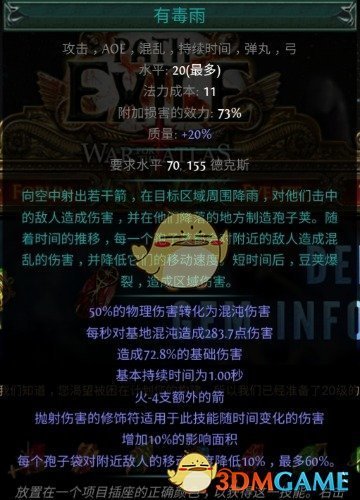 另外, 配上穿透效果, 当穿透敌人时, 每次穿透都会造成一次爆炸以及产生地板毒. 当然, 着重在重叠多重爆炸伤害的地板毒伤就会被牺牲了, 因为毒伤不会叠加而且伤害会被GMP等等降得很低. 不过....多重爆炸同时也会造成多次中毒效果,如果你有用新的苦痛之捷你就知道这有多重要了腐蚀箭矢