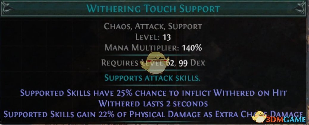 跟"凋零"技能给予的减益效果一样, 在击中时有25%让敌人承受6%更多混沌伤害持续2秒, 可叠加到15层. 这个持续时间可以被玩家增减.。