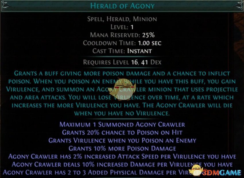 每层"毒性"给予苦痛爬行者2%攻击速度, 10%伤害, +2-3物理攻击.