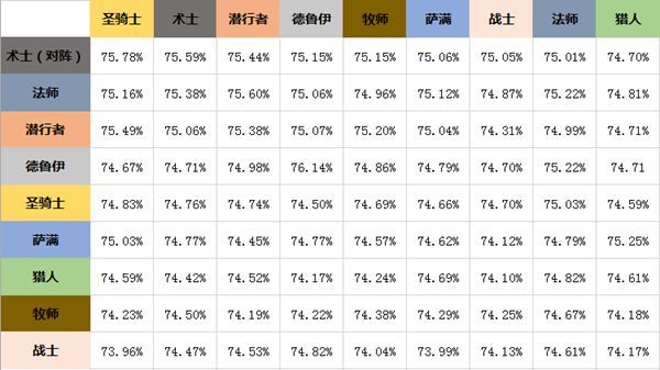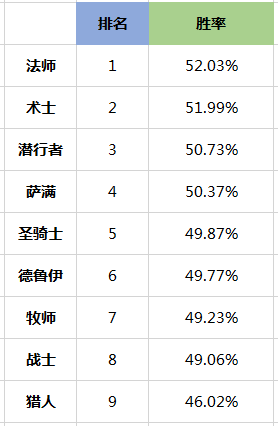 通过对局胜率表我们也可以得到一个事实:法师目前的表现是最好的,在对阵所有职业时,都具有一定的压制性,出色的英雄技能和优质的法术让这个职业长期处于顶尖水平。