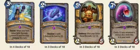 卡组类型分布我们可以看到法师都是携带的奥秘法,萨满则是三个偶数萨,一个沙德沃克萨,骑士则是三个奇数骑,一个快攻骑。