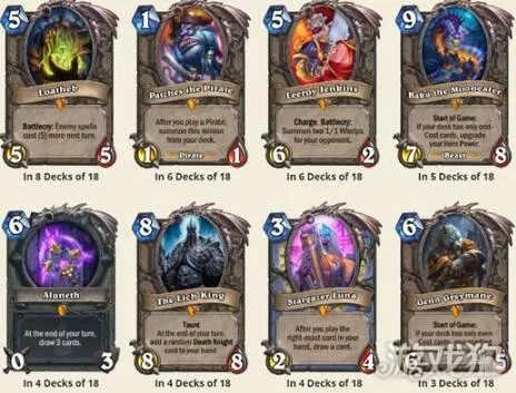 这是最流行的橙卡排名,塞布成为第一,18套卡组中8套都带了塞布,在一系列的快攻中速中,这张卡都能塞进去,而且效果不错,帕奇斯和火车王都有6个卡组携带了他们,巴库和吉恩也上榜了,看来狂野模式奇偶系列也非常流行。
