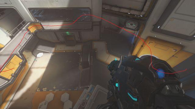这是这个点最为常见的一种拉点方式。出生走左边以后,在小房间里稍加整顿便大加速直接向点中冲去。这样的优势是拉点距离是所有方法中最短的,所以暴露在敌方火力下的时间也是最短的,路上甚至还有几根柱子作为掩体。在大锤举盾的情况下,此方法可以基本忽视对方的远程火力,唯一需要注意的只有对方奥丽莎的吸和安娜的禁疗了。需要注意的是,此方法拉点的过程中无论对方什么英雄前来阻挠,都应该基本上无视的向目的地冲去。很多人在路上看到对方猩猩落下来就会停下来集火猩猩,但这样做的同时会让全队密集的暴露在对方远程火力之下,非常容易造成减员,因此一定要先到达目的地再与对方进行交战。