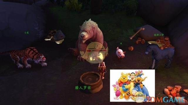 在斯托颂谷地中,大家还发现了动画角色小熊维尼也来到了游戏里,和他的伙伴们在谷地建立了一个小小的营地。他们都坐在一个蜜糖罐前,点击罐子会获得艾泽里特奖励。因为小熊维尼喜欢吃蜂蜜,所以地上到处都是乱扔的蜜糖罐子。