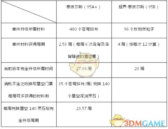 上表可以看出升级泰波尔斯95A+以及95B防具所需要的理论周期论数据,但星空裂缝可以产出苍穹碎片兑换材料天空之愿。