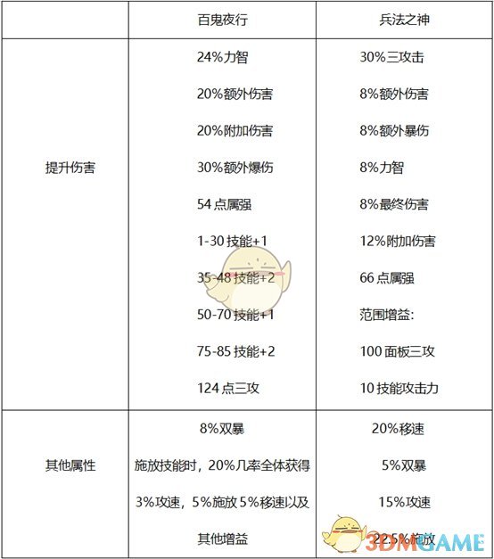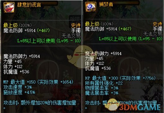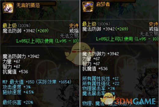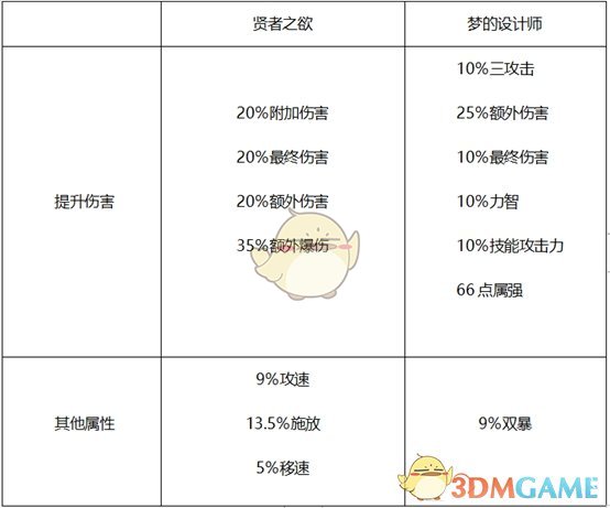 由于每22点属强约提升百分之10的伤害,因此表面看上去两套的伤害加成是一样的。但实际上呢贤者之欲套的加成类型并不如另一套多,所以在提升率方面存在稀释的情况。值得注意的是贤者之欲有着极高的三速加成,非常适合小号刷图搬砖用。梦的设计师伤害加成类型较多,稀释较少且有暴击加成,适合想去打团成长的号。