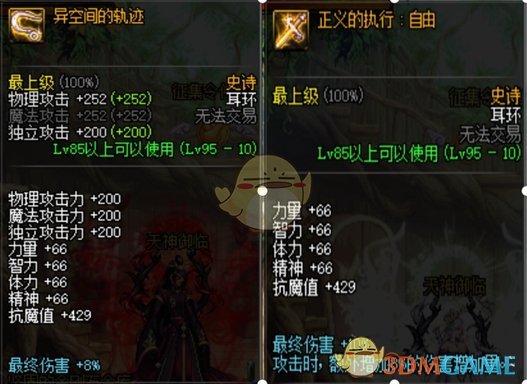 由于四维和双攻加成比较多,显然面板不高职业基础较低的职业选择虚幻空间能拥有更大家的提升率。而正义裁决套装由于有技能等级的加成,更适合诸如复仇者、天帝等拥有多个被动技能的职业,此外它的5%命中率加成,在某些时候也能起到关键的作用。