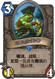 战斗号角被削弱成5费后,其实也只算是一张效果很普通的卡而已。主要好处还是在中期把卡组的低费卡过滤掉,避免后期抽到。不然以争夺场面来说,菌菇、斩棘刀并不会比较差。圣骑的石丘防卫者特别强,因为圣骑有1/1/1圣盾嘲讽、弗丁、塔林姆,可以依据局面需要选择想要的嘲讽强牌。因此圣骑任何组法,其实都非常适合加入石丘,不过为了强调快攻,这个组法我就只放一张。