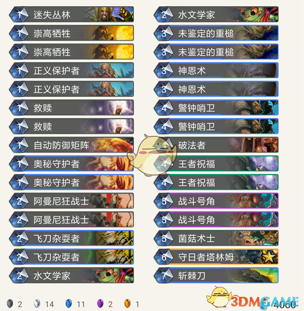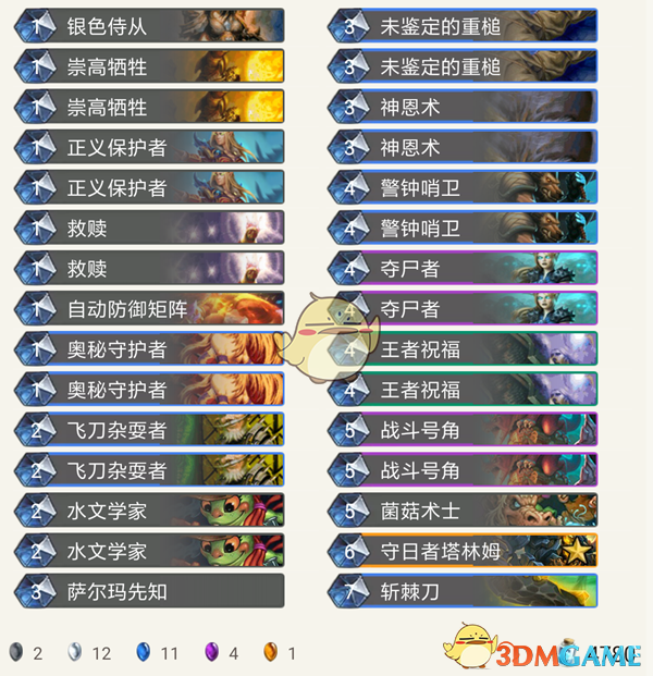 这副牌是非常非常便宜的卡组,甚至可以0传说。上面这个是我改成纯蓝白卡的组法。甚至我认为这样组根本没有比较弱。最重要的警钟哨卫、奥秘守护者+奥秘体系都没有受影响,甚至多了一张迷失丛林搭配飞刀、菌菇,让前期更容易打赢场面。