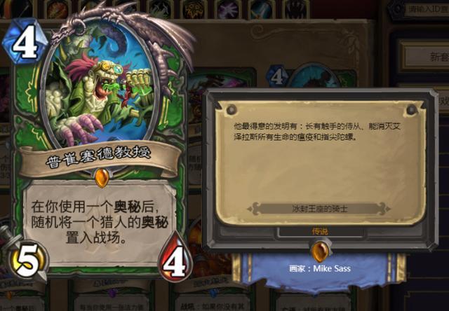 在炉石传说里面,他作为猎人的专属橙卡,4-5-4的身材可以算得上是不错了,效果是当我们使用一张奥义卡的时候,会将一张猎人奥秘置于我们顶上。这个卡的意思就是挂奥秘买一送一,这张卡在场时你挂一个奥秘会免费送一个奥秘挂你头上。普崔塞德教授在中期压一波场还是很牛的,裸下不亏,触发特效就赚。
