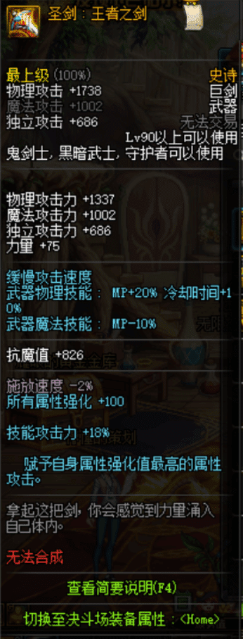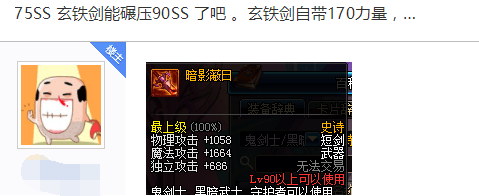 不过最近有网友说90版本 75SS 玄铁剑 用到死。 无能能替代 自身力量+170 ,近距离攻击力+50% 面板物理攻击都比 90SS 王者圣剑还高 ,拿还打个毛,基础属性碾压90级史诗武器啊。